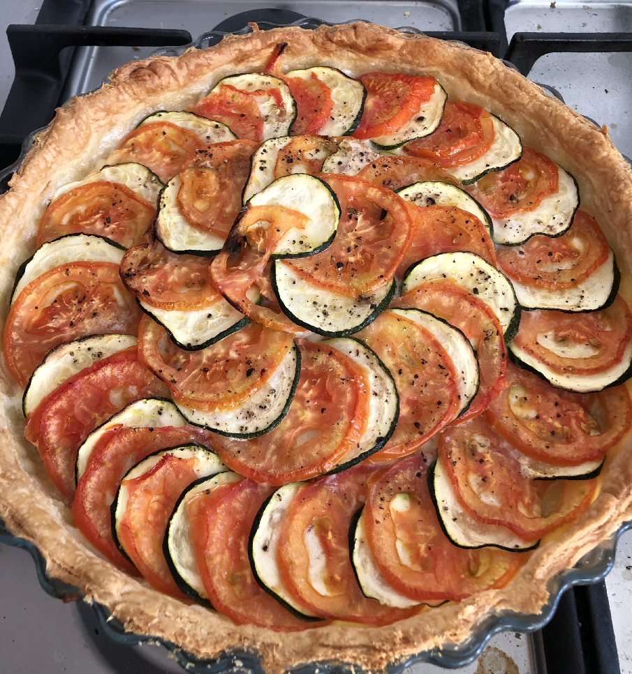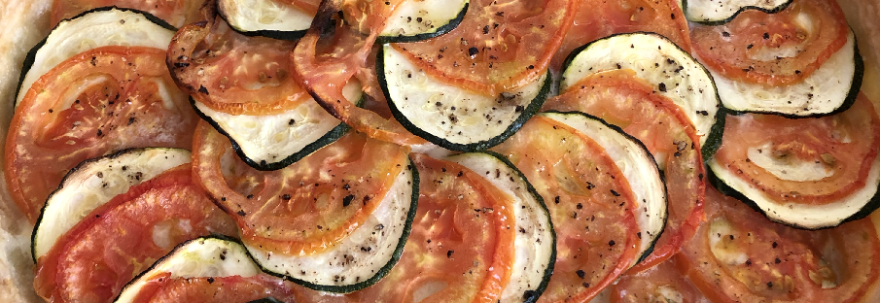 5. Disposer les tranches de courgettes et de tomates les unes à la suite des autres en rond autour de la pâte en commencant par l’extérieur, l’idée c’est de faire un peu comme un tian